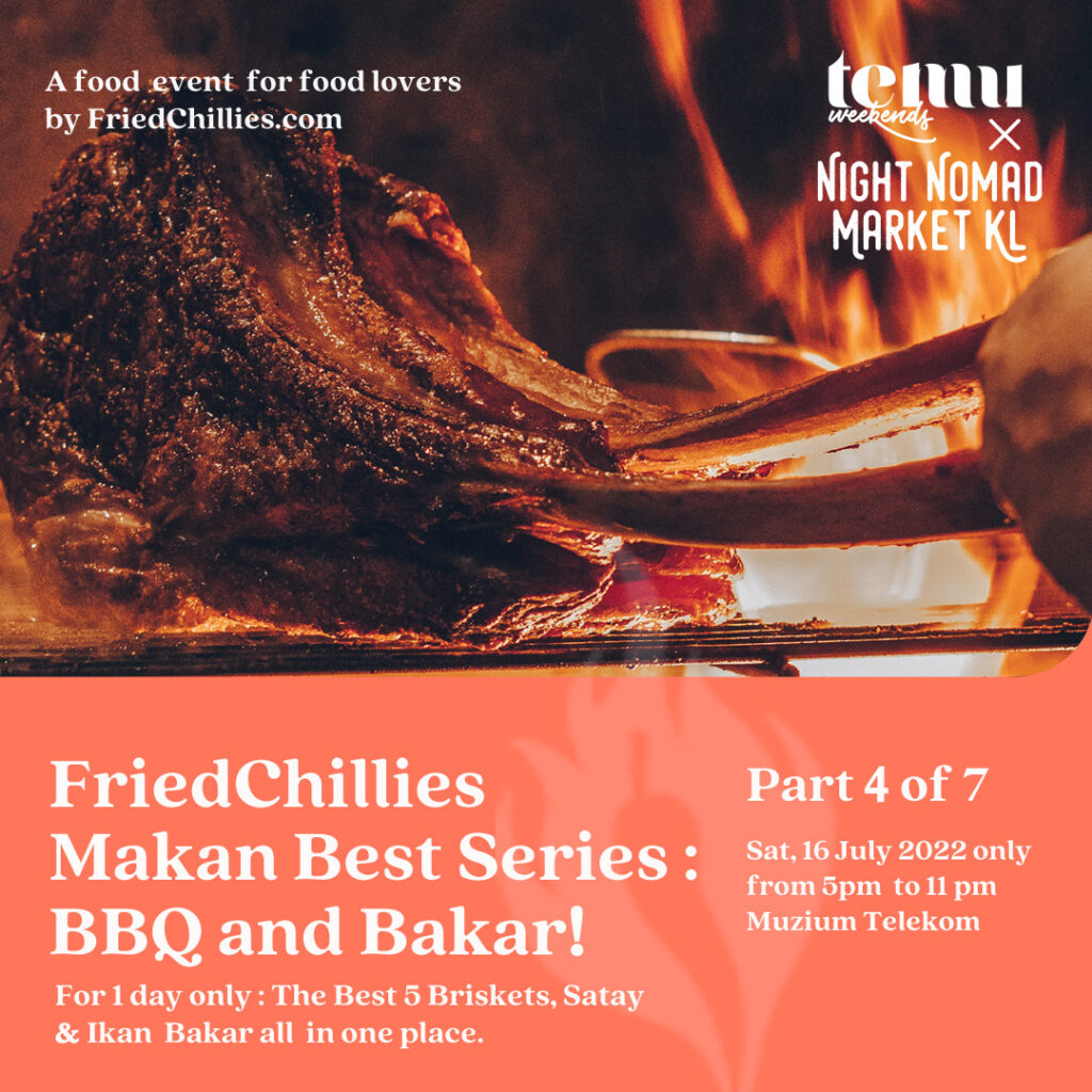 Beard Brothers, Pitboy BBQ, Ayam Mashwi Gombak, Cowboys Barbeque dan Ikan Bakar Seri Melaka Jalan Bellamy, bakal bergabung untuk satu petang yang penuh keenakan pada 16 Julai ini (Sabtu), dari jam 5 petang hingga 11 malam di TEMU Weekends x Night Nomad Market KL, Muzium Telekom, Kuala Lumpur. Acara ini merupakan yang keempat dalam siri FriedChillies Makan Best Series. Ayuh, sebarkan!