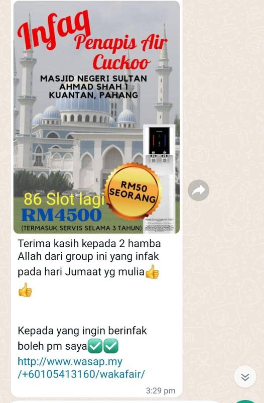 “Masjid Negeri Sultan Ahmad 1 𝗧𝗜𝗗𝗔𝗞 𝗣𝗘𝗥𝗡𝗔𝗛 menjalankan apa jua kempen Infaq Penapis Air Cuckoo seperti yang sedang tular sekarang.”