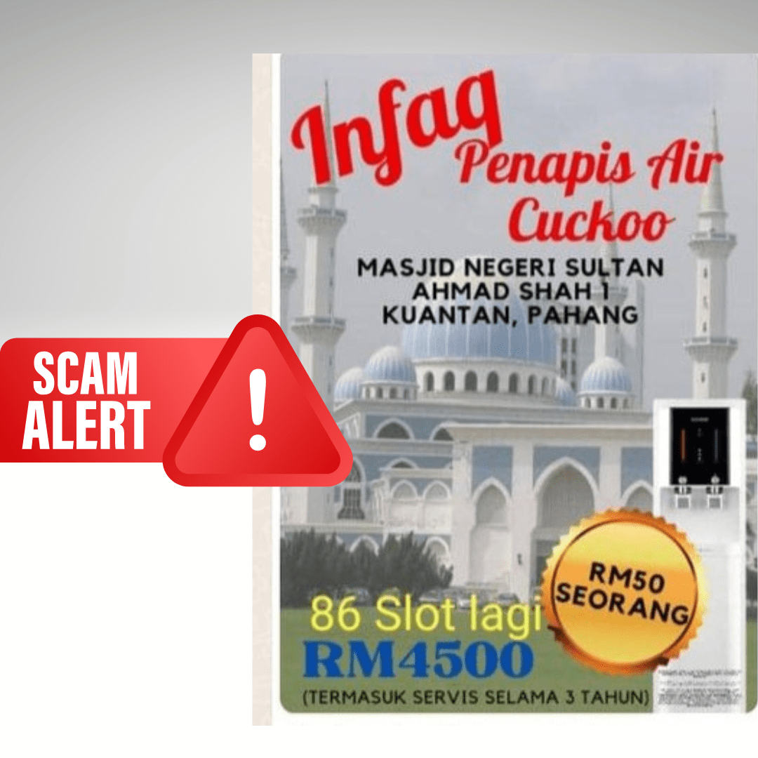 “Masjid Negeri Sultan Ahmad 1 𝗧𝗜𝗗𝗔𝗞 𝗣𝗘𝗥𝗡𝗔𝗛 menjalankan apa jua kempen Infaq Penapis Air Cuckoo seperti yang sedang tular sekarang.”
