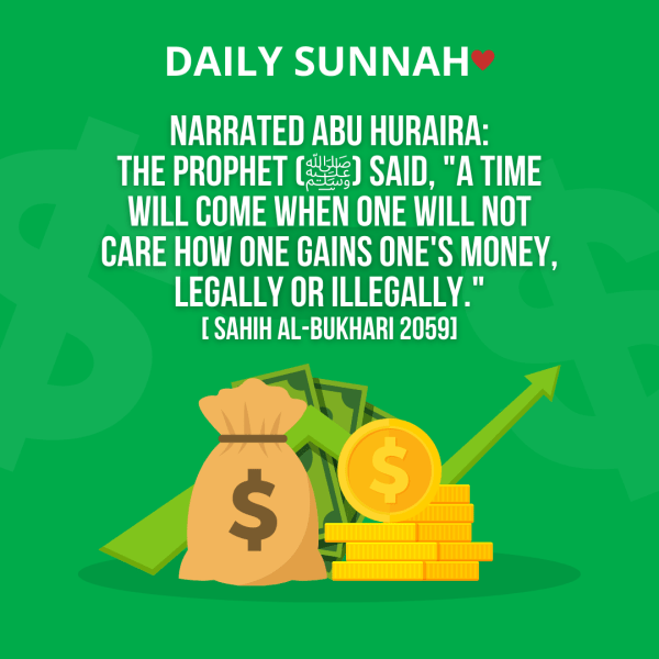 Diriwayatkan Abu Huraira, Rasulullah (saw) bersabda yang maksudnya: “Akan datang kepada manusia suatu masa, iaitu; seseorang tidak lagi peduli dari mana dia mendapatkan harta, apakah dari jalan halal atau haram.” (HR Al-Bukhari : 2059)