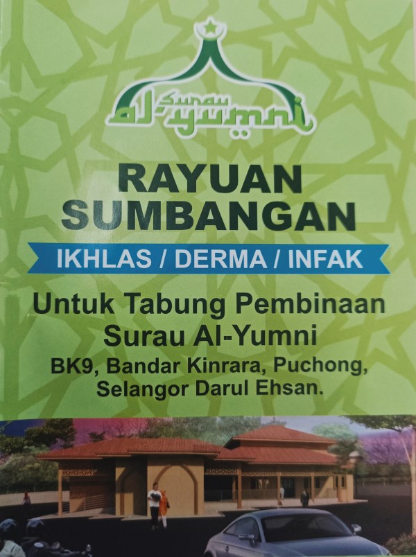 Surau Al-Yumni BK9, Bandar Kinrara, Puchong, Selangor, yang dirancang pembinaannya pada 2015 akhirnya akan menjadi kenyataan. Kontraktor yang dilantik telah menerima dan menandatangani Surat Tawaran (Letter of Acceptance) pada 4 April 2022 bagi membina surau dengan kos RM1.42 juta. Oleh itu, pihak Surau memohon sumbangan ikhlas untuk menderma dan berinfak atas tujuan pembinaan Surau Al-Yumni.