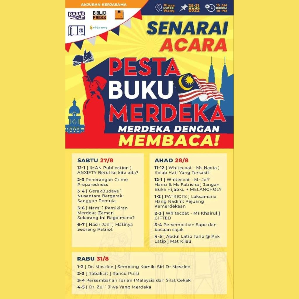 Peminat buku, ambil perhatian! Pesta Buku Merdeka mula berlangung dari hari ini, 25 Ogos hingga 31 Ogos, 2022 dari 10 pagi hingga 10 malam bertempat di Ruang LG, Plaza Sungei Wang, Kuala Lumpur.
