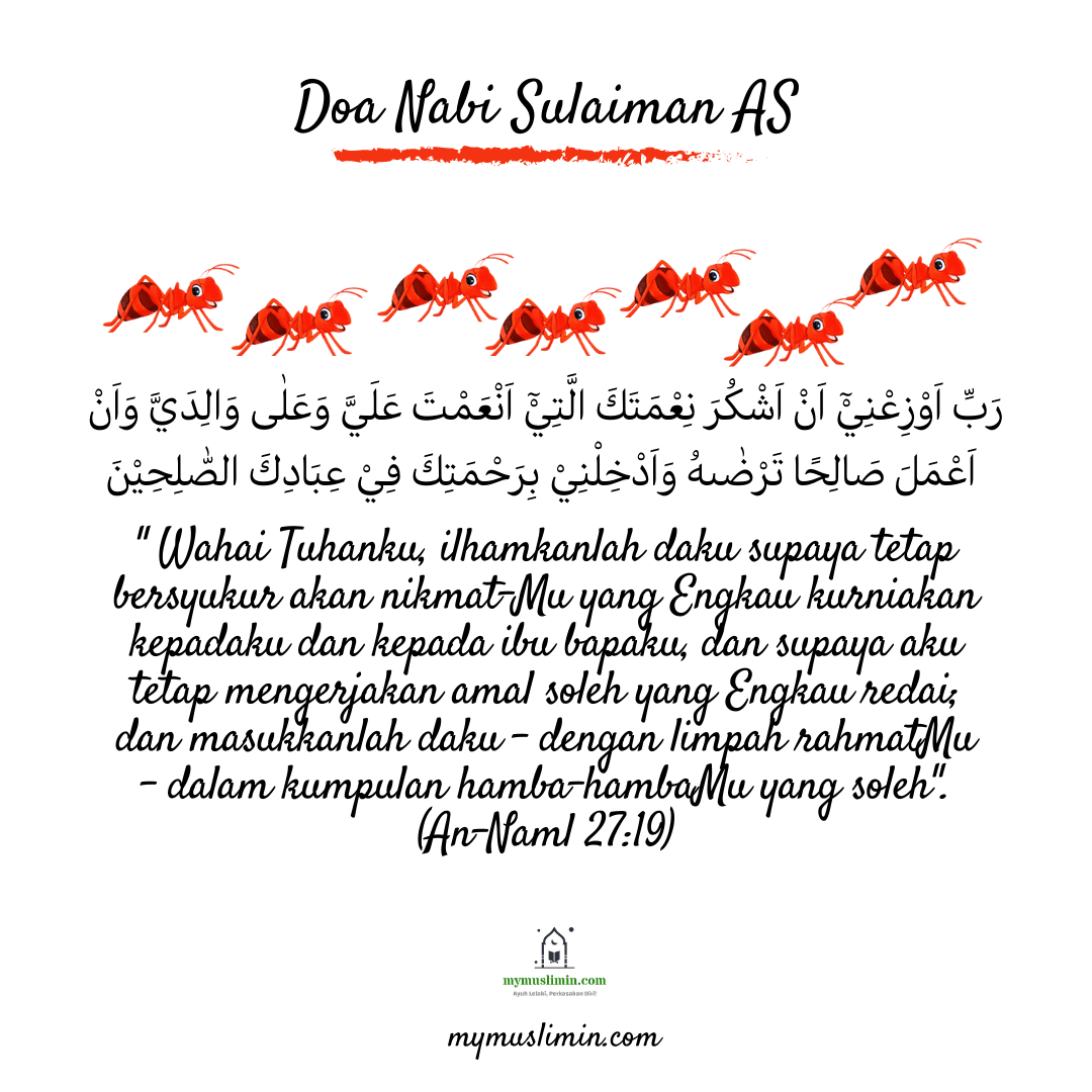 Bacalah kisah Nabi Sulaiman AS ketika mereka sampai ke “Waadin-Naml”, dan di sana beliau telah mendengar sekumpulan semut berkata-kata. Melihat kejadian itu, Nabi Sulaiman AS memanjatkan doa kepada Allah SWT agar beliau dapat mensyukuri nikmat yang dikurniakan-Nya dengan mengerjakan amal soleh yang diredai Allah dan memohon supaya Allah memasukkannya ke dalam golongan orang soleh yang terdahulu.