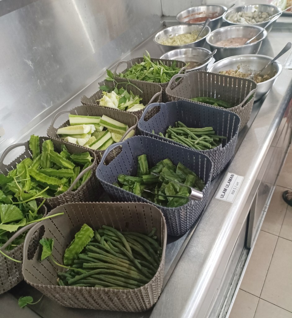 Dah selesai memilih protein, sila bergerak ke bahagian ulam-ulaman yang menyediakan daun pegaga, daun selom, timun, bendi, kacang panjang, kacang botol di antara pilihan.