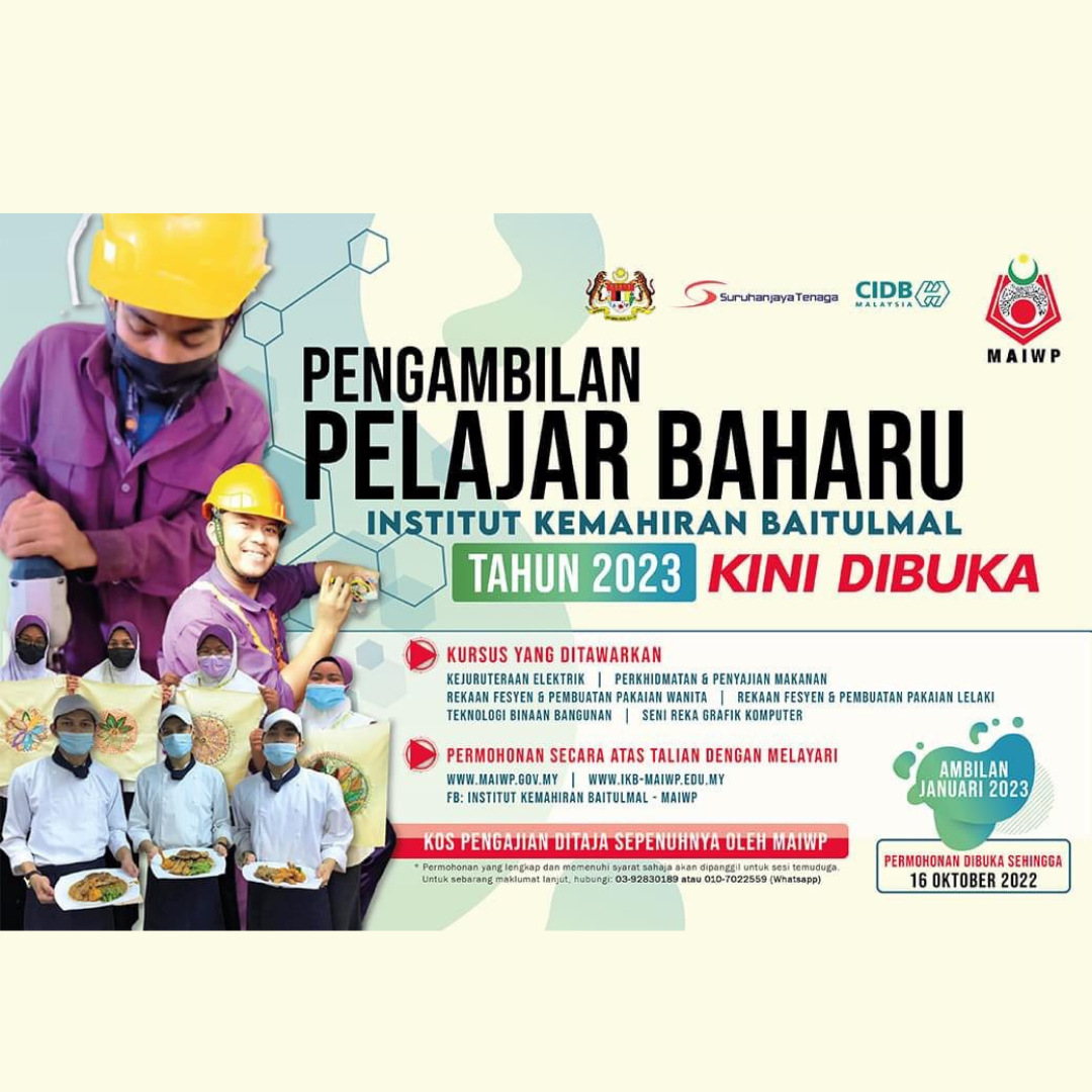 Pengambilan pelajar baharu tahun 2023 ke Institut Kemahiran Baitulmal (IKB), MAJLIS AGAMA ISLAM WILAYAH PERSEKUTUAN (MAIWP) kini dibuka melalui Sistem Permohonan Online.