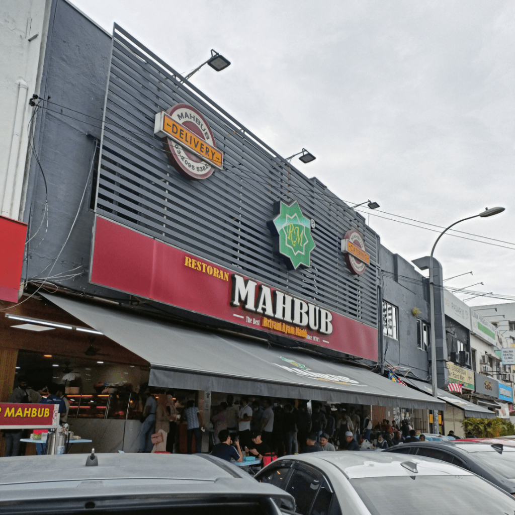 Suasana di Restoran Mahbub ini sentiasa meriah dengan pelanggan di dalam restoran, di luar restoran yang beratur panjang untuk bungkus, dan penghantar makanan yang menunggu tempahan, terutama di waktu makan tengahari hari Jumaat.