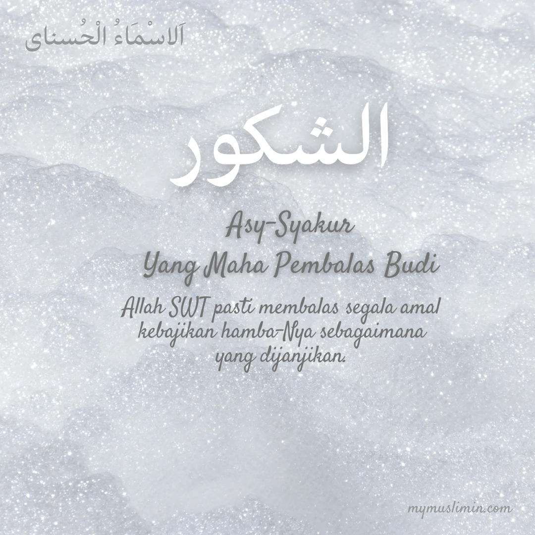 Asmaul Husna yang ke-36 ialah Asy-Syakur yang membawa erti Tuhan Yang Maha Pembalas. Allah SWT pasti membalas segala amal kebajikan hamba-Nya sebagaimana yang dijanjikan. Orang-orang mukmin yang beramal soleh akan menerima balasan syurga, sementara orang-orang kafir dan ahli maksiat akan menerima balasan neraka.