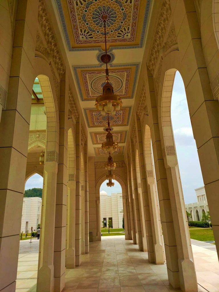 Kebanyakan seni bina dalaman masjid ini ditempah khas termasuk ukiran kayu pada dinding di dewan solat, penggunaan saduran berwarna emas, tulisan khat serta penggunaan bongkah jubin sebagai dinding berhampiran mimbar. Bahagian dalaman kubah utama dihiasi dengan cat emas 24k. Seni dalaman masjid ini menggabungkan elemen dari Mesir, Turki, Dubai, Maghribi dan China.