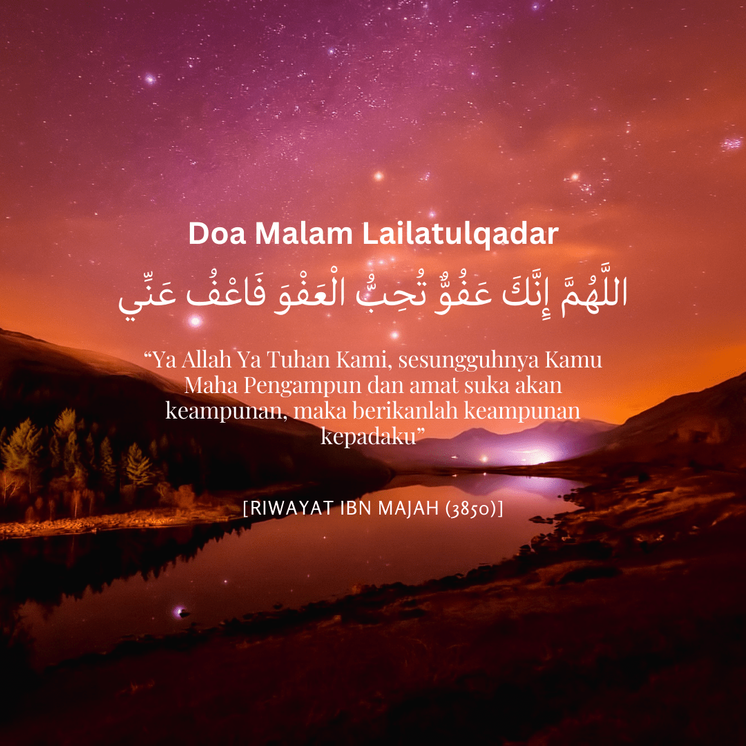 Aisyah RA meriwayatkan, beliau bertanya Nabi SAW: “Wahai Nabi Allah, jika aku bertemu dengan malam al-Qadar maka apa yang sepatutnya aku ucapkan. Nabi SAW bersabda: “Ya Allah Ya Tuhan Kami, sesungguhnya Kamu Maha Pengampun dan amat suka akan keampunan, maka berikanlah keampunan kepadaku”