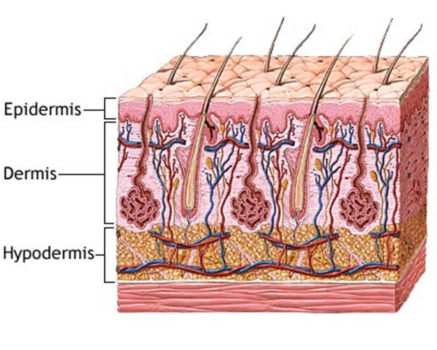 Lapisan Epidermis adalah lapisan luar yang terus berganti, tipis dan tidak mempunyai pembuluh darah ataupun sel saraf. Lapisan dermis terletak di bawah epidermis terdiri atas sel-sel yang longgar dengan letak yang berjauhan, serta banyak mengandungi pembuluh darah. Pada bahagian kulit terdapat reseptor khusus untuk dapat membezakan sentuhan, tekanan, suhu (panas dan sejuk), serta rasa sakit. Sebahagian besar reseptor terletak pada lapisan dermis dan ada juga yang terletak pada lapisan epidermis. Pada hujung saraf tersebut ada yang terbungkus kapsul jaringan ikat (disebut korpuskel) dan ada yang tidak terbungkus (disebut hujung-hujung saraf bebas).