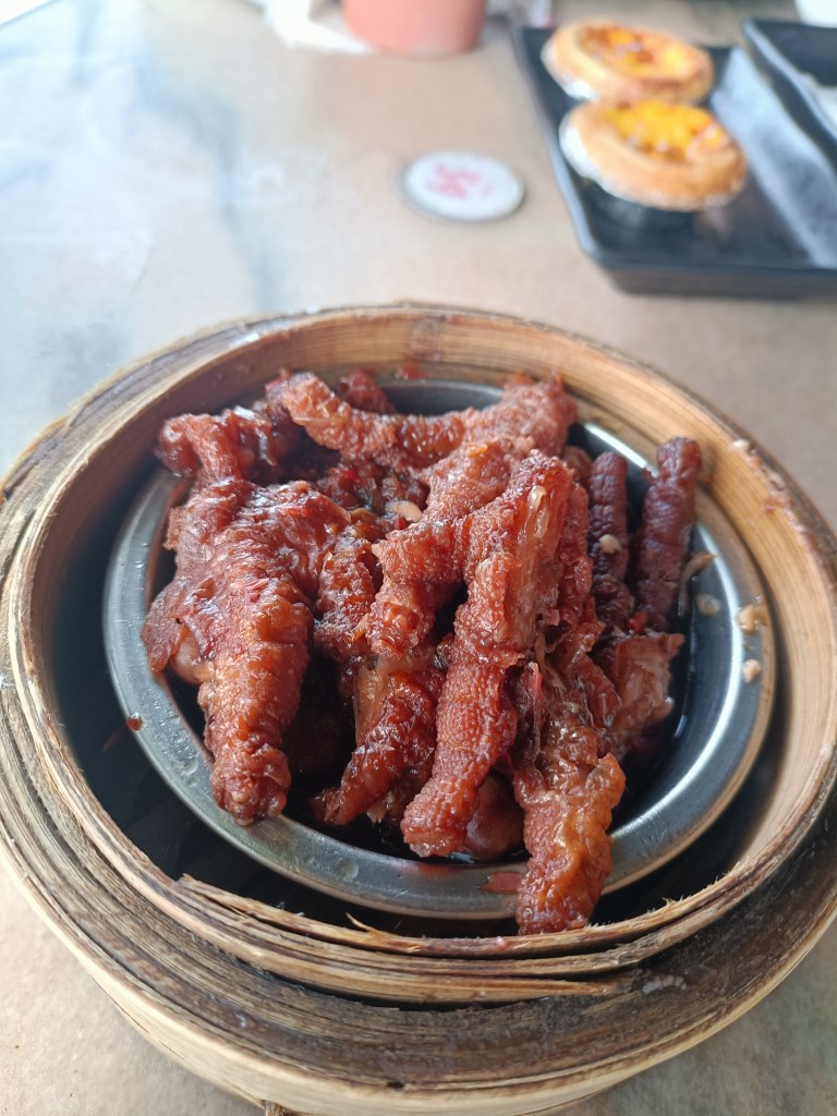 Inti dumpling selalunya isi ayam, udang atau kombinasinya. Jadi, bagi mereka yang alah kepada makanan laut, sila bertanya dahulu sebelum menjamu selera. Warna biru pada kulit dumpling itu ialah pewarna semulajadi Bunga Telang yang banyak ditanam di sekeliling restoran. Tiada apa-apa perbezaan daripada segi rasa tetapi lain pula cerita bila dilihat astetik fotonya. Sudah makan dim sum dan dumpling, hidangan kaki ayam dan kek lobak goreng juga lazat untuk dicuba.