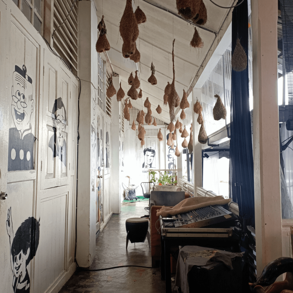 Dekor Sarang Art Hub unik dan mencerminkan personaliti dan kecenderungan si pemilik. Kerusi makan di sini bukan kerusi makan biasa, kerusi pengarah filem antara yang tersedia.