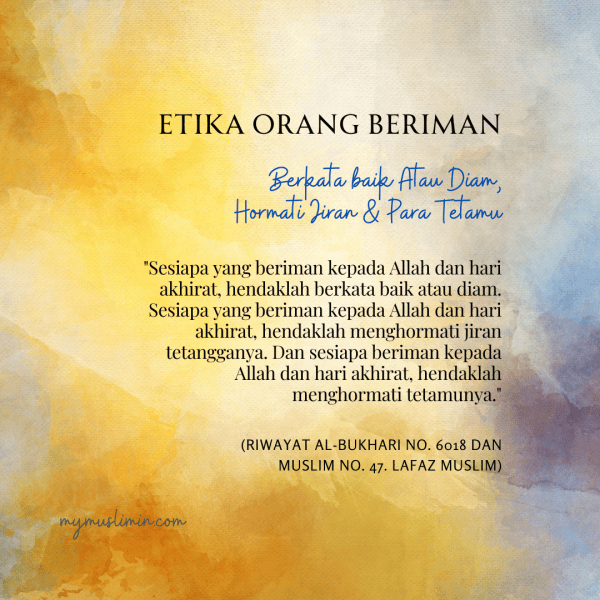 Daripada Abu Hurairah RA, beliau berkata bahawa sesungguhnya Rasulullah SAW bersabda: مَنْ كَانَ يُؤْمِنُ بِاللهِ وَالْيَوْمِ الْآخِرِ ؛ فَلْيَقُلْ خَيْرًا أَوْ لِيَصْمُتْ. وَمَنْ كَانَ يُؤْمِنُ بِاللهِ وَالْيَوْمِ الْآخِرِ؛ فَلْيُكْرِمْ جَارَهُ. وَمَنْ كَانَ يُؤْمِنُ بِاللهِ وَالْيَوْم الْآخِرِ ؛ فَلْيُكْرِمْ ضَيْفَهُ. Maksudnya: "Sesiapa yang beriman kepada Allah dan hari akhirat, hendaklah berkata baik atau diam. Sesiapa yang... Continue Reading →