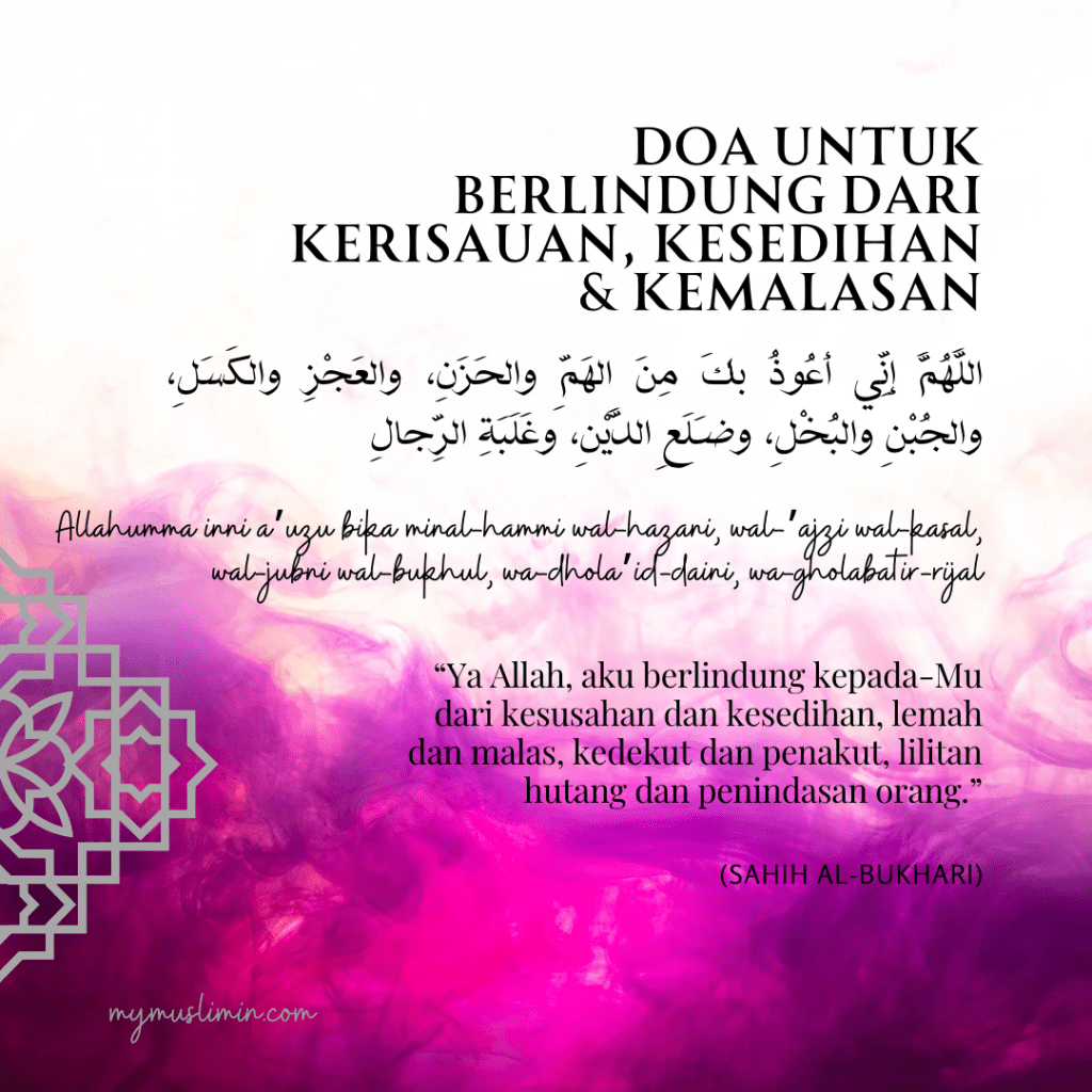 “Ya Allah, aku berlindung kepada-Mu dari kesusahan dan kesedihan, lemah dan malas, kedekut dan penakut, lilitan hutang dan penindasan orang.”