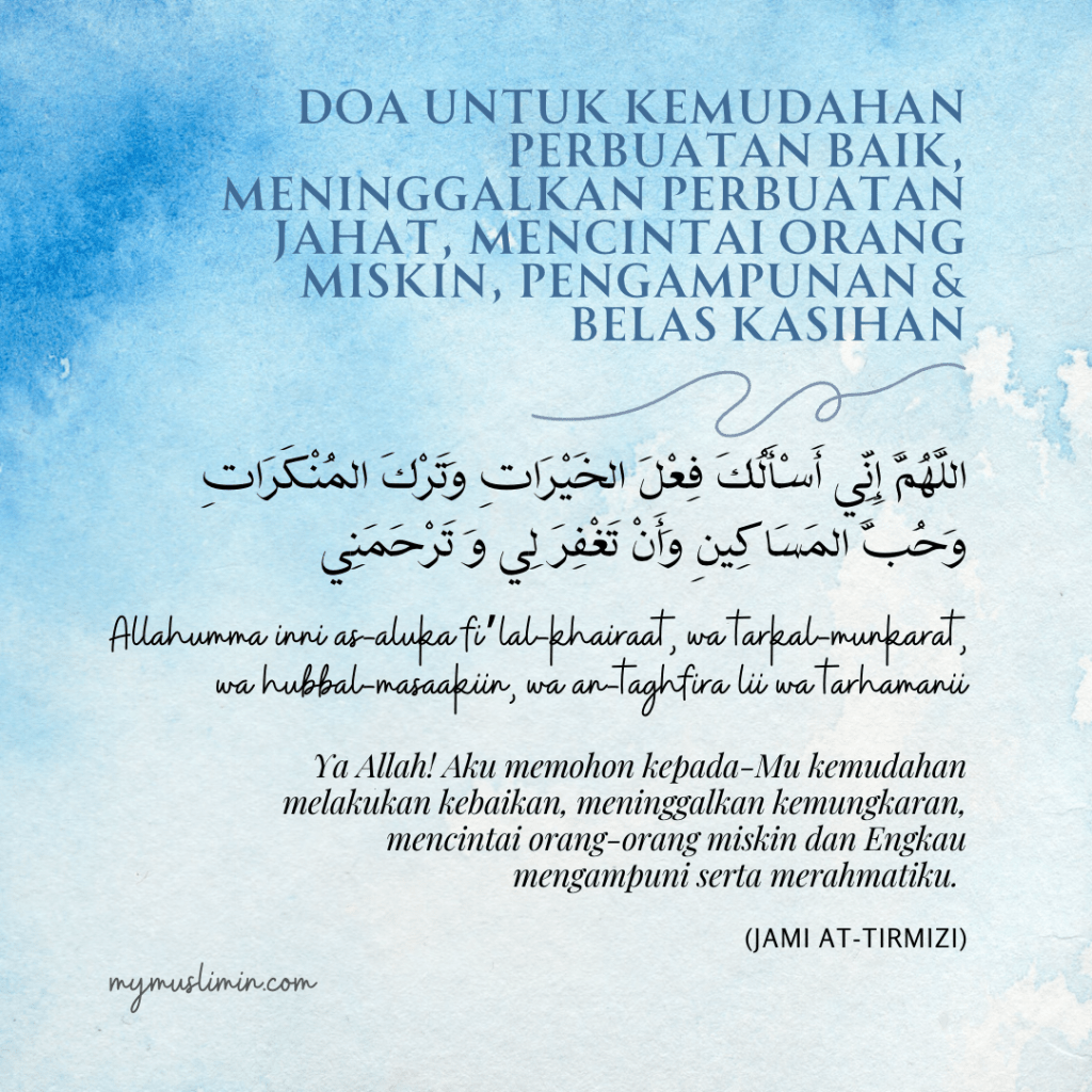 Ya Allah! Aku memohon kepada-Mu kemudahan melakukan kebaikan, meninggalkan kemungkaran, mencintai orang-orang miskin dan Engkau mengampuni serta merahmatiku.