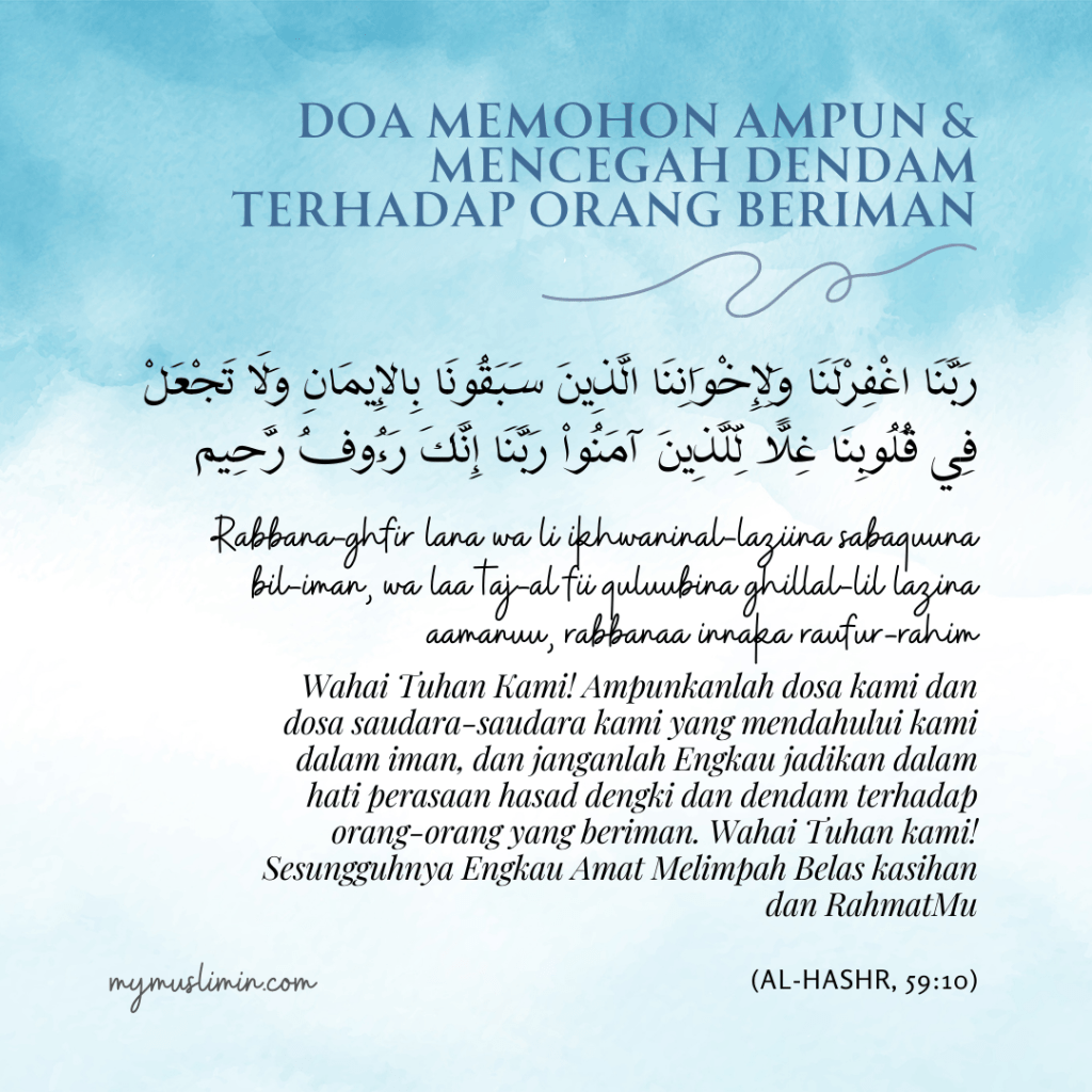 “Wahai Tuhan Kami! Ampunkanlah dosa kami dan dosa saudara-saudara kami yang mendahului kami dalam iman, dan janganlah Engkau jadikan dalam hati perasaan hasad dengki dan dendam terhadap orang-orang yang beriman. Wahai Tuhan kami! Sesungguhnya Engkau Amat Melimpah Belas kasihan dan RahmatMu”