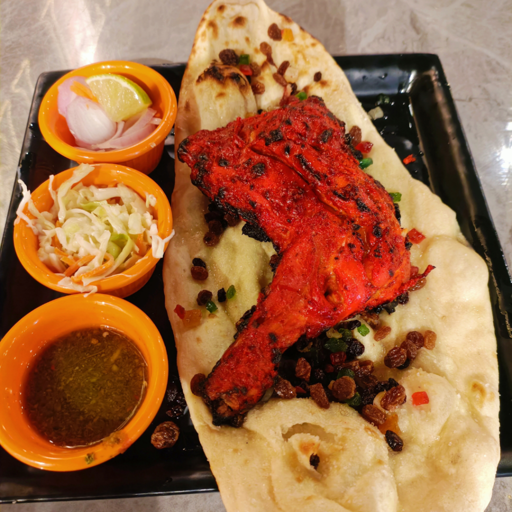 Kami juga menempah hidangan Naan Kashmiri dengan Ayam Tandoori. Untuk yang tidak tahu, Naan Kashmiri ini sama seperti naan lain dari segi dohnya tetapi dimeriahkan lagi dengan buah-buahan kering, kacang, dan rempah-rempah seperti ceri glace, kismis, badam, gajus, jintan, dan halba. Naan Kashmirinya tidak lokek taburan buah-buahan kering, setiap gigitan bahan-bahan itu dapat dirasa. Naannya lembut dan sedap, padanan dengan ayam tandoori yang lembut, berempah dan perisa itu sangat tepat dan memuaskan hati.