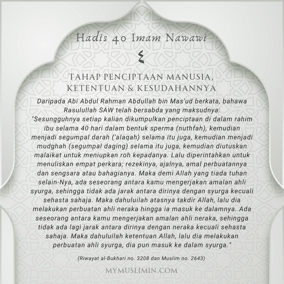 “Sesungguhnya setiap kalian dikumpulkan penciptaan di dalam rahim ibu selama 40 hari dalam bentuk sperma (nuthfah), kemudian menjadi segumpal darah (‘alaqah) selama itu juga, kemudian menjadi mudghah (segumpal daging) selama itu juga, kemudian diutuskan malaikat untuk meniupkan roh kepadanya. Lalu diperintahkan untuk menuliskan empat perkara; rezekinya, ajalnya, amal perbuatannya dan sengsara atau bahagianya. Maka demi Allah yang tiada tuhan selain-Nya, ada seseorang antara kamu mengerjakan amalan ahli syurga, sehingga tidak ada jarak antara dirinya dengan syurga kecuali sehasta sahaja. Maka dahuluilah atasnya takdir Allah, lalu dia melakukan perbuatan ahli neraka hingga ia masuk ke dalamnya. Ada seseorang antara kamu mengerjakan amalan ahli neraka, sehingga tidak ada lagi jarak antara dirinya dengan neraka kecuali sehasta sahaja. Maka dahuluilah ketentuan Allah, lalu dia melakukan perbuatan ahli syurga, dia pun masuk ke dalam syurga.”