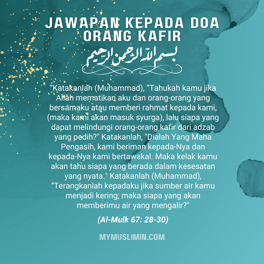 “Katakanlah (Muhammad), ‘Tahukah kamu jika Allah mematikan aku dan orang- orang yang bersamaku atau memberi rahmat kepada kami, (maka kami akan masuk surga), lalu siapa yang dapat melindungi orang-orang kafir dari adzab yang pedih?””