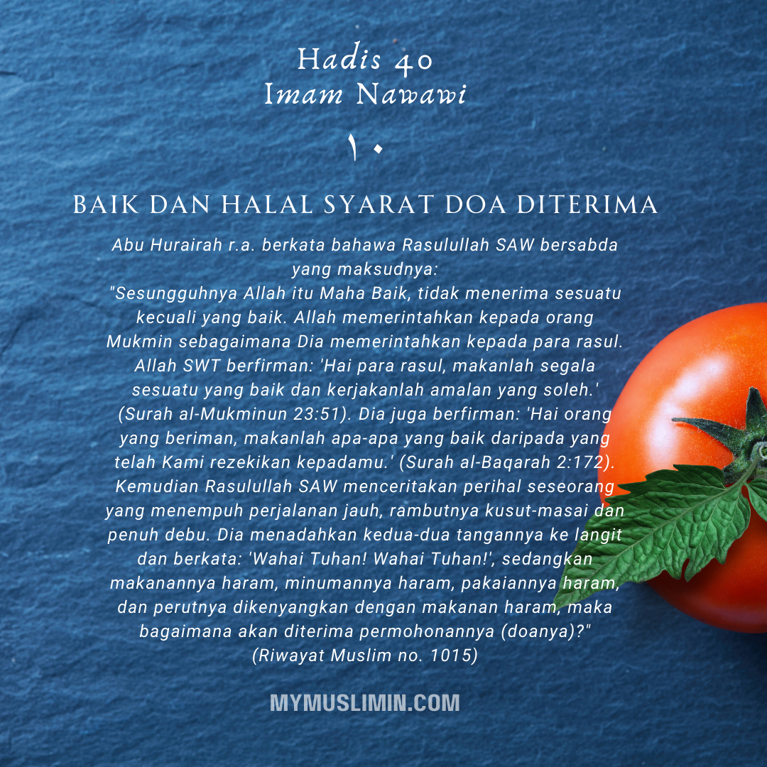 Hadis kesepuluh ini berisi anjuran membelanjakan sebahagian daripada harta yang halal dan melarang membelanjakan harta yang haram. Makanan, minuman, pakaian, dan sebagainya hendaknya benar-benar diperoleh daripada sumber yang halal tanpa bercampur yang syubhah. Orang yang ingin memohon doa kepada Allah hendaklah memerhatikan syarat-syarat yang tersebut pada hadis ini.