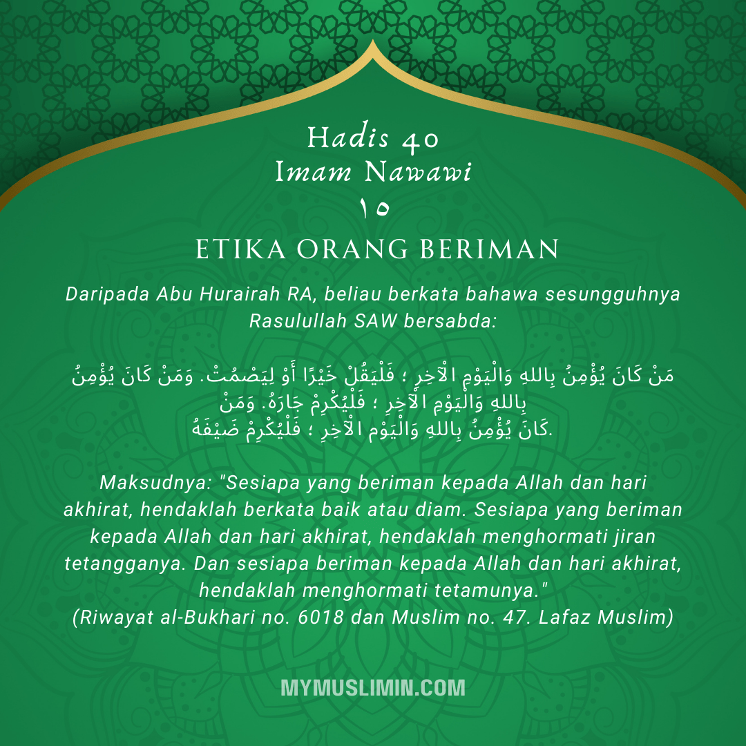 Maksudnya: “Sesiapa yang beriman kepada Allah dan hari akhirat, hendaklah berkata baik atau diam. Sesiapa yang beriman kepada Allah dan hari akhirat, hendaklah menghormati jiran tetangganya. Dan sesiapa beriman kepada Allah dan hari akhirat, hendaklah menghormati tetamunya.”