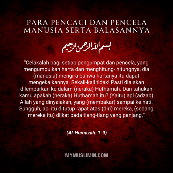 Klik untuk membaca tafsir ringkas Surah al-Humazah 104: 1-9 yang mengingatkan kita tentang betapa bahayanya sikap suka mencaci & mencela manusia, serta balasan kepada mereka yang mempunyai sifat-sifat keji ini.