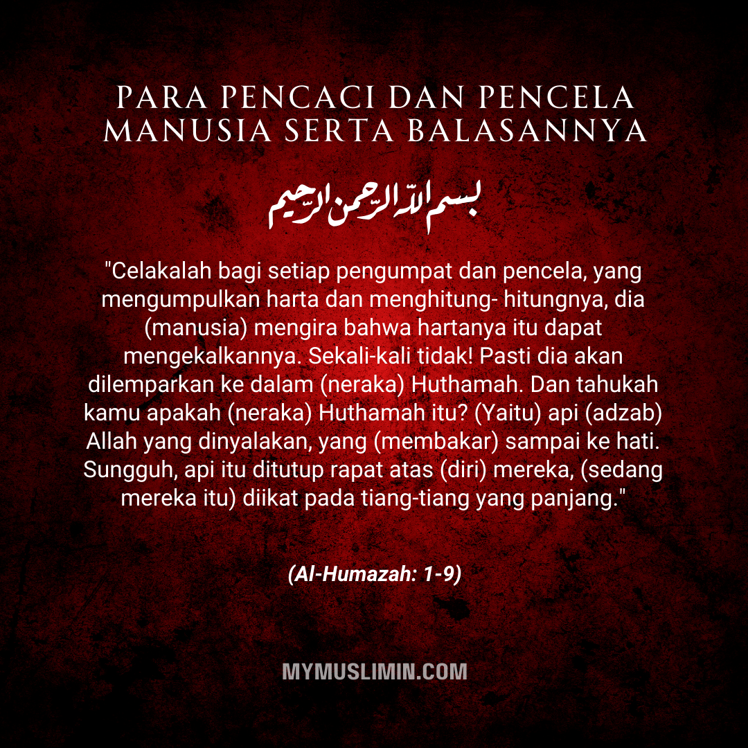 “Celakalah bagi setiap pengumpat dan pencela, yang mengumpulkan harta dan menghitung- hitungnya, dia (manusia) mengira bahwa hartanya itu dapat mengekalkannya. Sekali-kali tidak! Pasti dia akan dilemparkan ke dalam (neraka) Huthamah. Dan tahukah kamu apakah (neraka) Huthamah itu? (Yaitu) api (adzab) Allah yang dinyalakan, yang (membakar) sampai ke hati. Sungguh, api itu ditutup rapat atas (diri) mereka, (sedang mereka itu) diikat pada tiang-tiang yang panjang.”