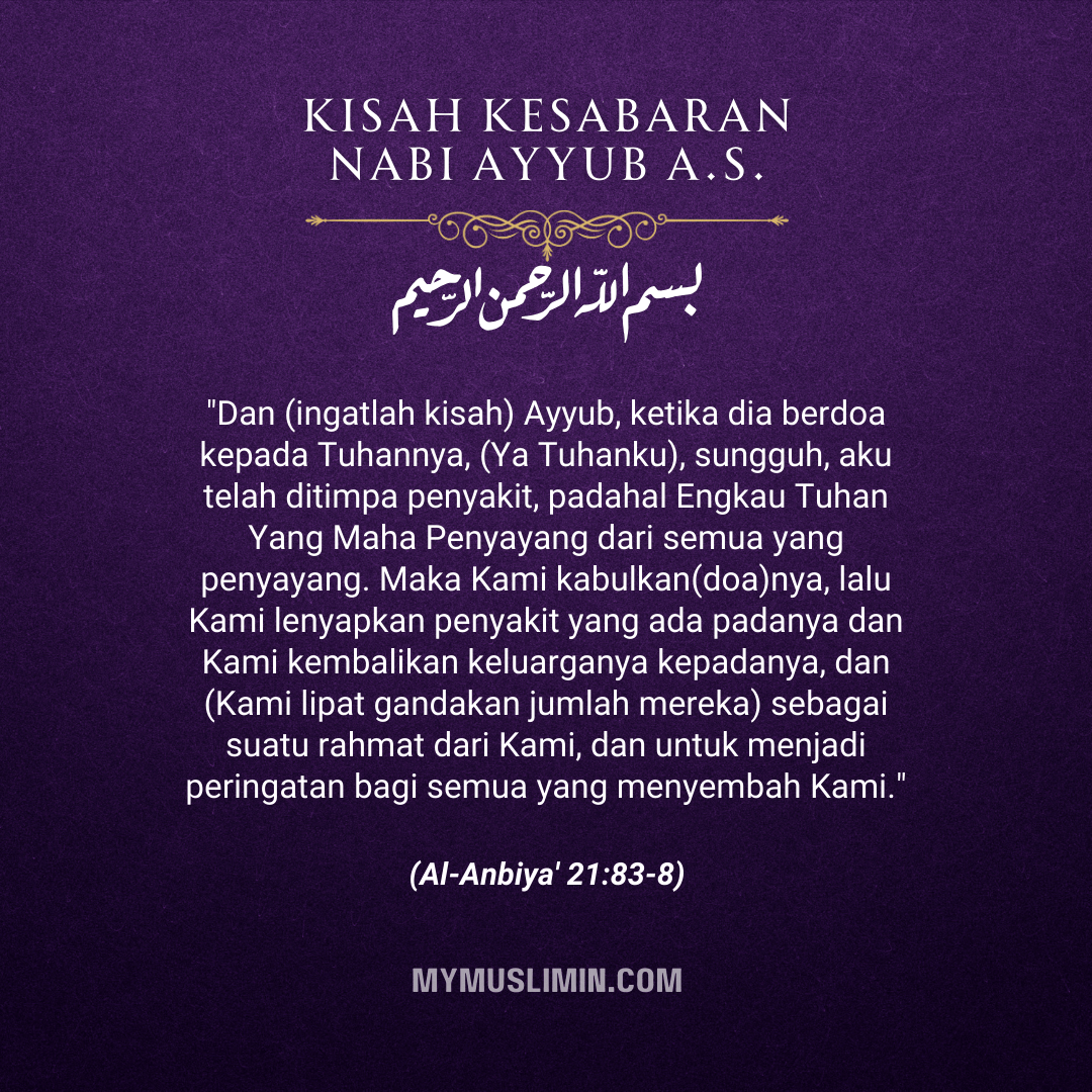 Maksudnya: “Dan (ingatlah kisah) Ayyub, ketika dia berdoa kepada Tuhannya, (Ya Tuhanku), sungguh, aku telah ditimpa penyakit, padahal Engkau Tuhan Yang Maha Penyayang dari semua yang penyayang. Maka Kami kabulkan(doa)nya, lalu Kami lenyapkan penyakit yang ada padanya dan Kami kembalikan keluarganya kepadanya, dan (Kami lipat gandakan jumlah mereka) sebagai suatu rahmat dari Kami, dan untuk menjadi peringatan bagi semua yang menyembah Kami.”