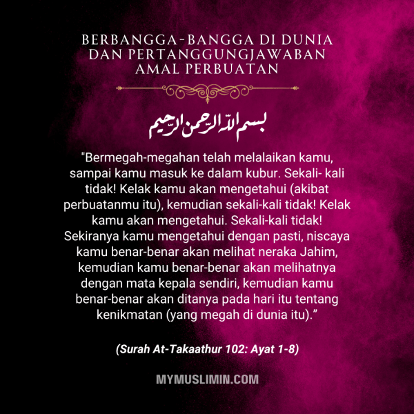 Klik untuk membaca tafsir ringkas Surah at-Takaathur 102: 1-8 yang memberi peringatan tentang kepertanggungjawaban amal perbuatan dan harta benda manusia di dunia.