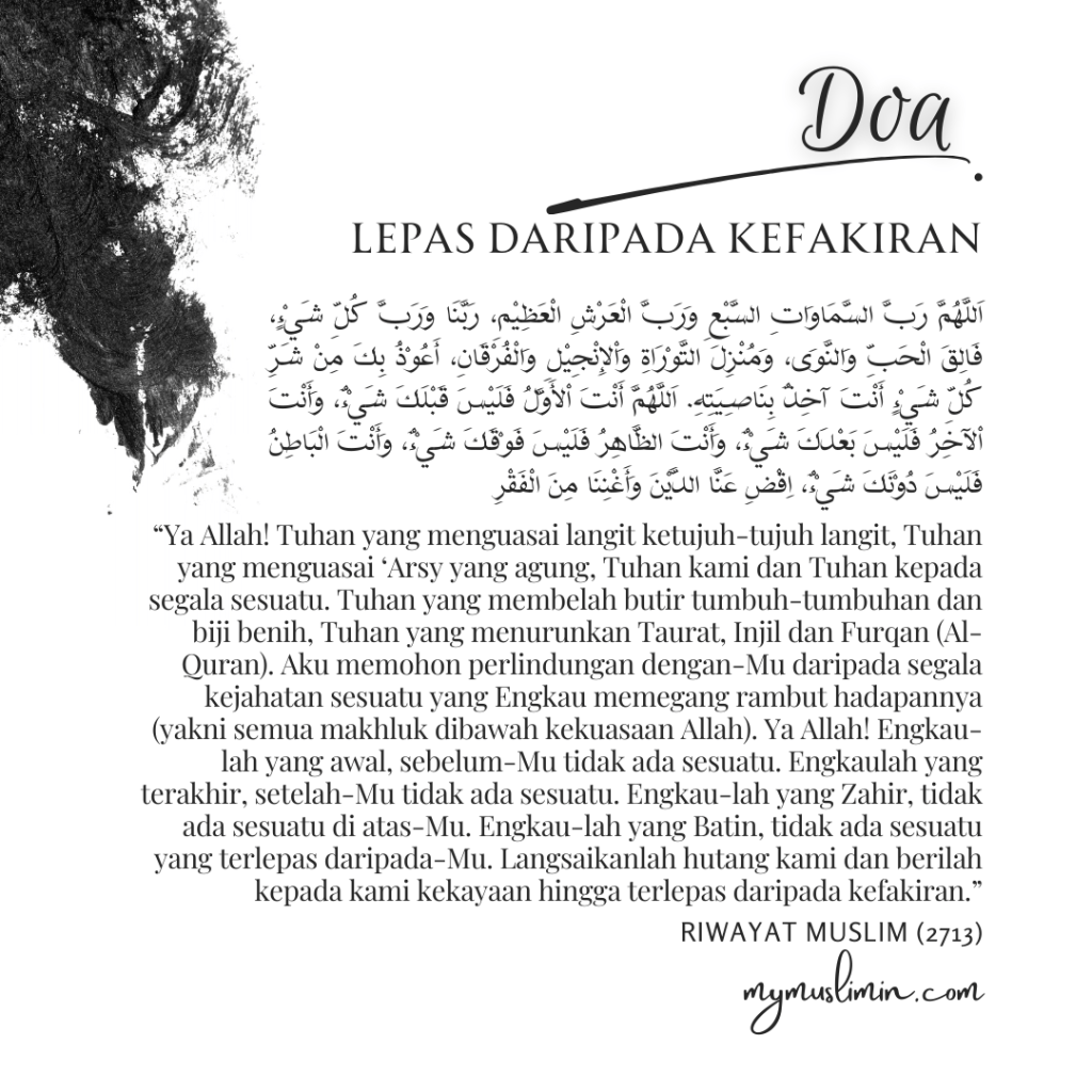 Maksudnya: “Ya Allah! Tuhan yang menguasai langit ketujuh-tujuh langit, Tuhan yang menguasai ‘Arsy yang agung, Tuhan kami dan Tuhan kepada segala sesuatu. Tuhan yang membelah butir tumbuh-tumbuhan dan biji benih, Tuhan yang menurunkan Taurat, Injil dan Furqan (Al-Quran). Aku memohon perlindungan dengan-Mu daripada segala kejahatan sesuatu yang Engkau memegang rambut hadapannya (yakni semua makhluk dibawah kekuasaan Allah). Ya Allah! Engkau-lah yang awal, sebelum-Mu tidak ada sesuatu. Engkaulah yang terakhir, setelah-Mu tidak ada sesuatu. Engkau-lah yang Zahir, tidak ada sesuatu di atas-Mu. Engkau-lah yang Batin, tidak ada sesuatu yang terlepas daripada-Mu. Langsaikanlah hutang kami dan berilah kepada kami kekayaan hingga terlepas daripada kefakiran.”