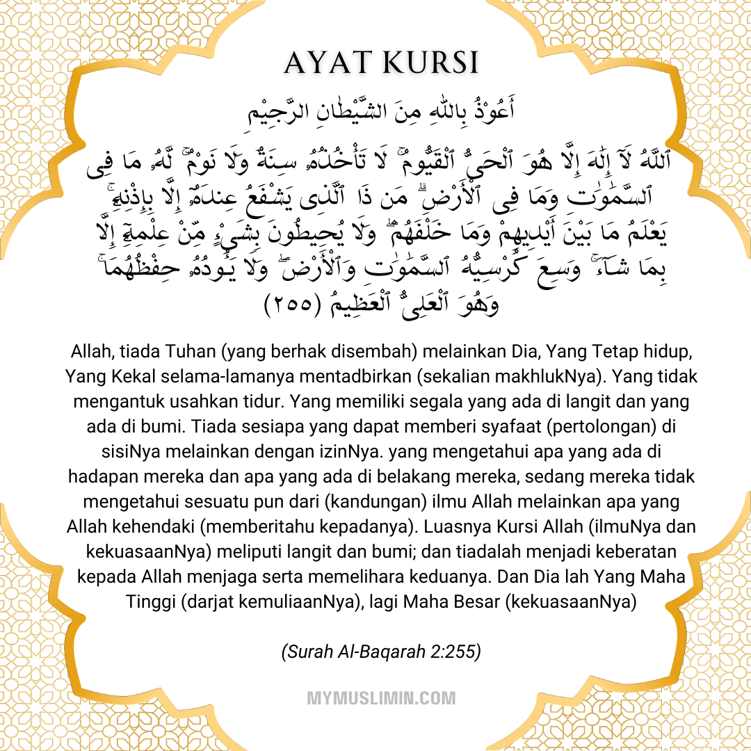 Allah, tiada Tuhan (yang berhak disembah) melainkan Dia, Yang Tetap hidup, Yang Kekal selama-lamanya mentadbirkan (sekalian makhlukNya). Yang tidak mengantuk usahkan tidur. Yang memiliki segala yang ada di langit dan yang ada di bumi. Tiada sesiapa yang dapat memberi syafaat (pertolongan) di sisiNya melainkan dengan izinNya. yang mengetahui apa yang ada di hadapan mereka dan apa yang ada di belakang mereka, sedang mereka tidak mengetahui sesuatu pun dari (kandungan) ilmu Allah melainkan apa yang Allah kehendaki (memberitahu kepadanya). Luasnya Kursi Allah (ilmuNya dan kekuasaanNya) meliputi langit dan bumi; dan tiadalah menjadi keberatan kepada Allah menjaga serta memelihara keduanya. Dan Dia lah Yang Maha Tinggi (darjat kemuliaanNya), lagi Maha Besar (kekuasaanNya)