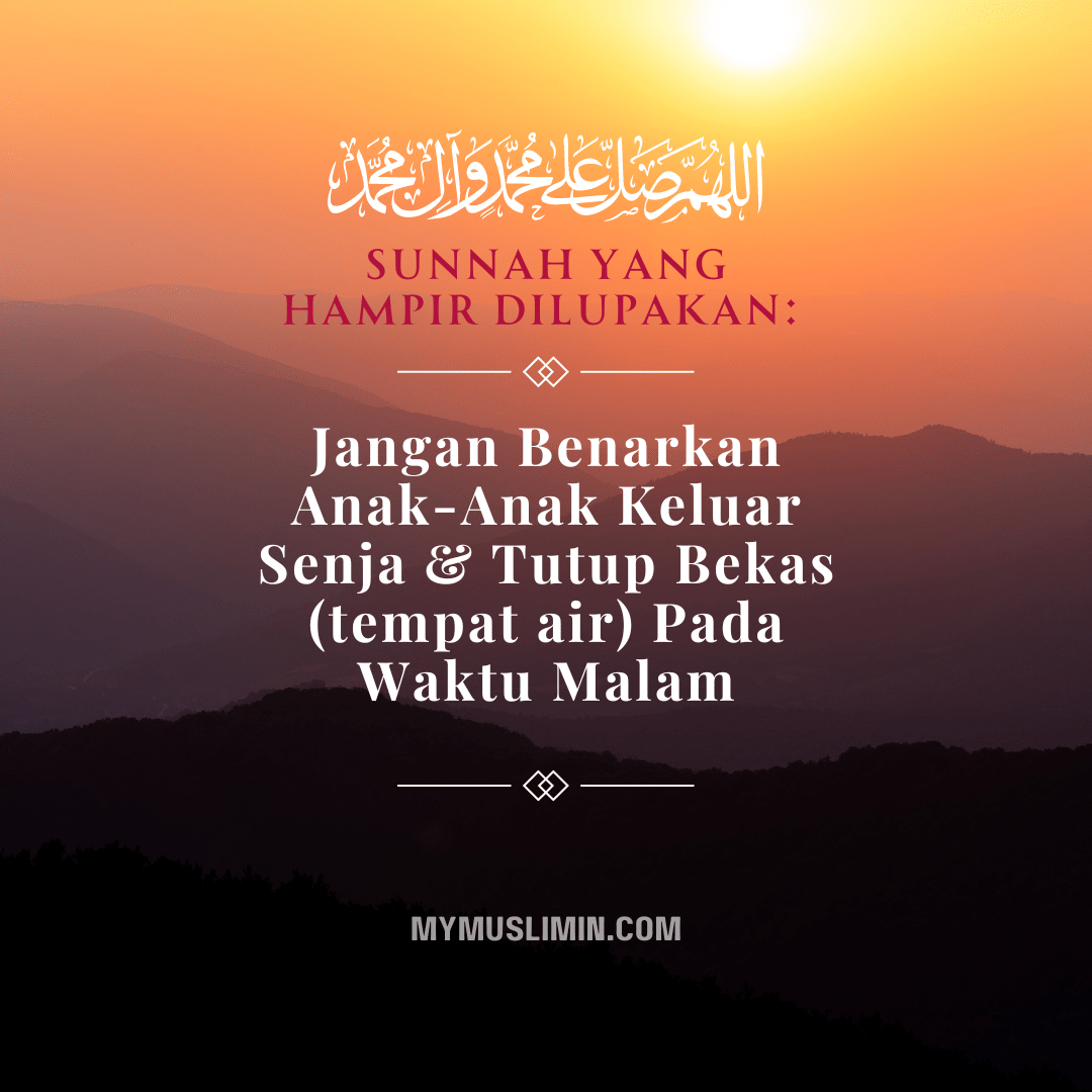 Maksud: “Apabila kegelapan malam telah tiba, tahanlah anak-anak kecil kamu di dalam rumah, kerana pada masa itu syaitan bertebaran. Apabila permulaan malam sudah tiba, lepaskanlah mereka, tutuplah pintu-pintu (termasuk tingkap) kamu dengan terlebih dahulu menyebut nama Allah kerana syaitan tidak akan dapat membuka pintu yang terkunci dengan menyebut nama Allah. Kemudian, ikatlah kendi-kendi air kamu (qirab adalah tempat air yang diperbuat daripada kulit dan di hujungnya di ikat dengan tali untuk menghalang kekotoran masuk) sambil menyebut nama Allah. Tutuplah bekas-bekas kamu sambil menyebut nama Allah meskipun hanya di tutup dengan sesuatu ala kadarnya.”