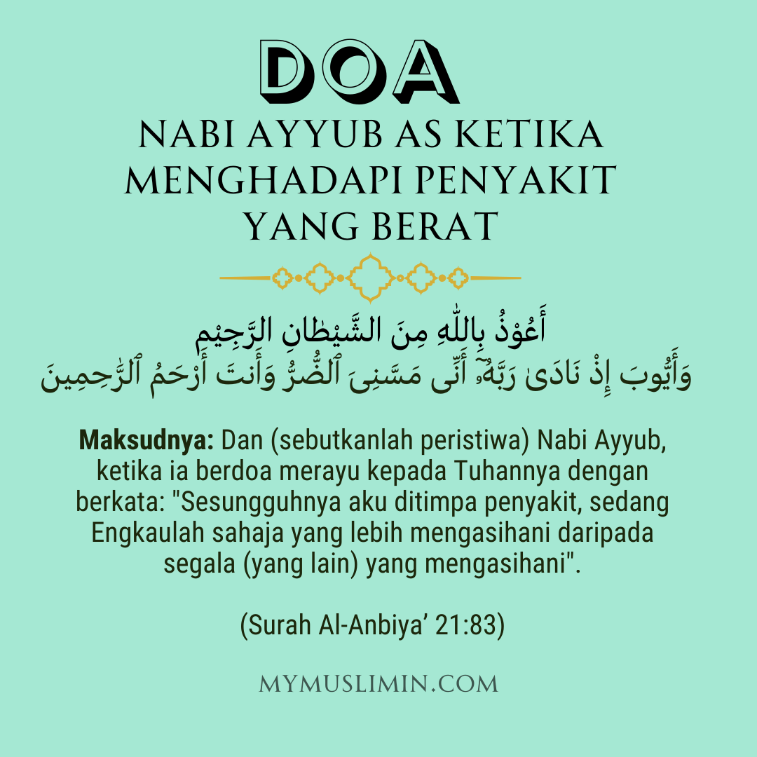 Maksudnya: Dan (sebutkanlah peristiwa) Nabi Ayub, ketika ia berdoa merayu kepada Tuhannya dengan berkata: “Sesungguhnya aku ditimpa penyakit, sedang Engkaulah sahaja yang lebih mengasihani daripada segala (yang lain) yang mengasihani”.