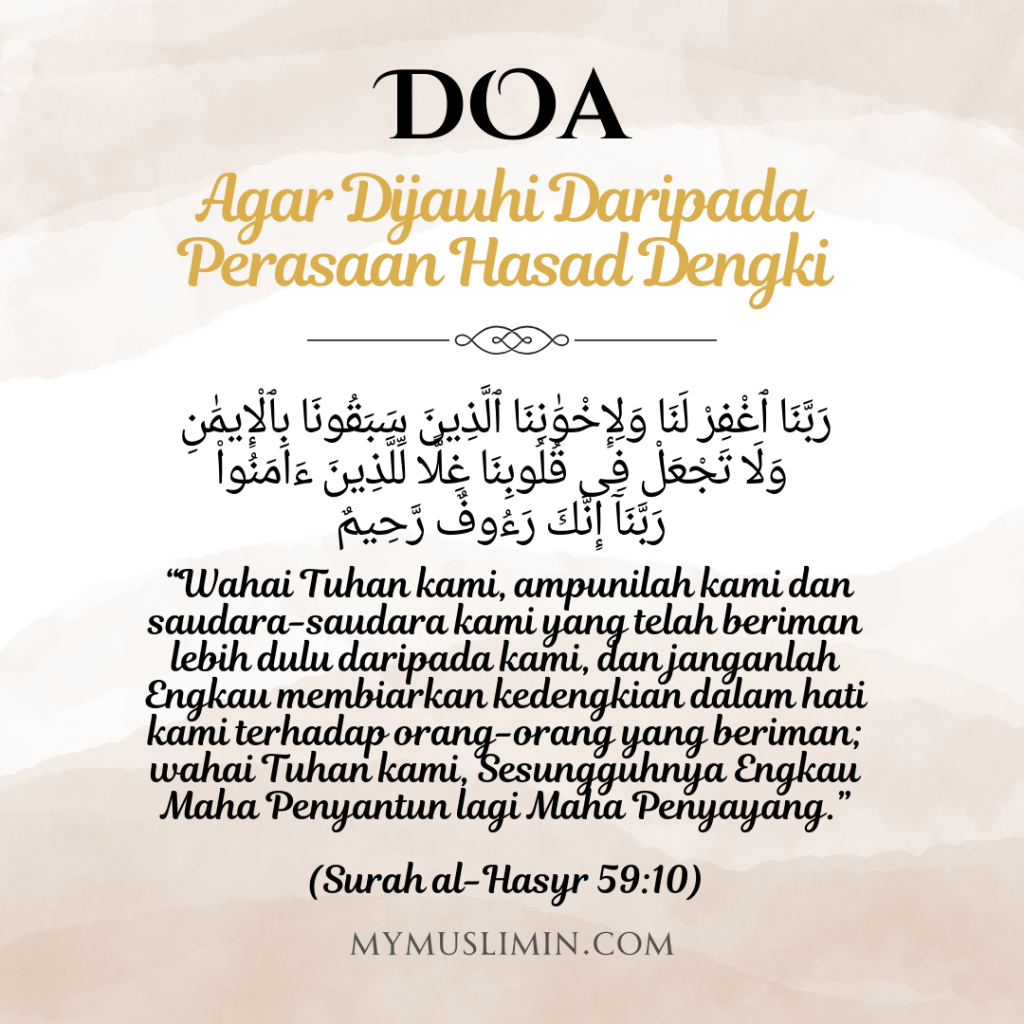 Maksudnya: “Wahai Tuhan kami, ampunilah kami dan saudara-saudara kami yang telah beriman lebih dulu daripada kami, dan janganlah Engkau membiarkan kedengkian dalam hati kami terhadap orang-orang yang beriman; wahai Tuhan kami, Sesungguhnya Engkau Maha Penyantun lagi Maha Penyayang.”