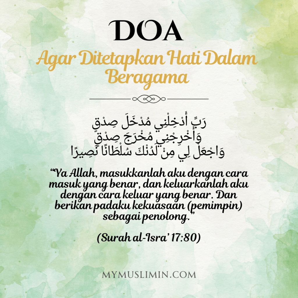 Maksudnya: “Ya Allah, masukkanlah aku dengan cara masuk yang benar, dan keluarkanlah aku dengan cara keluar yang benar. Dan berikan padaku kekuasaan (pemimpin) sebagai penolong.”