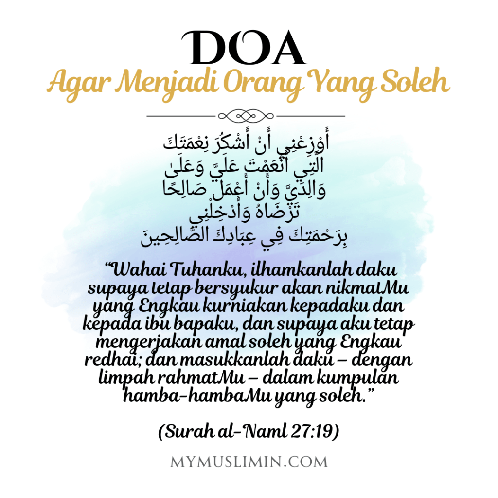 Maksudnya: “Wahai Tuhanku, ilhamkanlah daku supaya tetap bersyukur akan nikmatMu yang Engkau kurniakan kepadaku dan kepada ibu bapaku, dan supaya aku tetap mengerjakan amal soleh yang Engkau redhai; dan masukkanlah daku – dengan limpah rahmatMu – dalam kumpulan hamba-hambaMu yang soleh.”