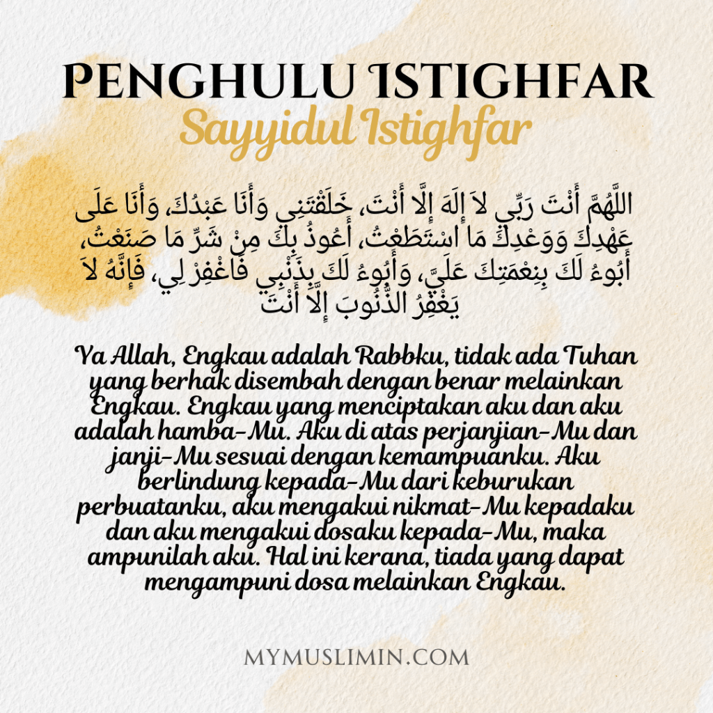 Maksudnya: “Sayyid al-Istighfar hendaklah kamu mengucapkan: Ya Allah, Engkau adalah Rabbku, tidak ada Tuhan yang berhak disembah dengan benar melainkan Engkau. Engkau yang menciptakan aku dan aku adalah hamba-Mu. Aku di atas perjanjian-Mu dan janji-Mu sesuai dengan kemampuanku. Aku berlindung kepada-Mu dari keburukan perbuatanku, aku mengakui nikmat-Mu kepadaku dan aku mengakui dosaku kepada-Mu, maka ampunilah aku. Hal ini kerana, tiada yang dapat mengampuni dosa melainkan Engkau.” Barangsiapa yang mengucapkannya (Sayyidul Istighfar) di waktu siang hari serta yakin dengannya, lalu dia meninggal pada hari itu sebelum waktu petang, maka dia termasuk dalam kalangan penghuni syurga. Dan barangsiapa yang mengucapkannya di waktu malam dengan penuh keyakinan lalu dia meninggal sebelum masuk waktu pagi, maka dia termasuk dalam kalangan penghuni syurga.” (HR Bukhari)