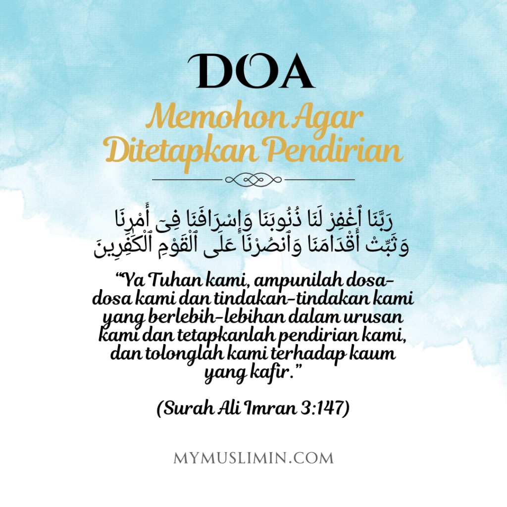 Maksudnya: “Ya Tuhan kami, ampunilah dosa-dosa kami dan tindakan-tindakan kami yang berlebih-lebihan dalam urusan kami dan tetapkanlah pendirian kami, dan tolonglah kami terhadap kaum yang kafir.”