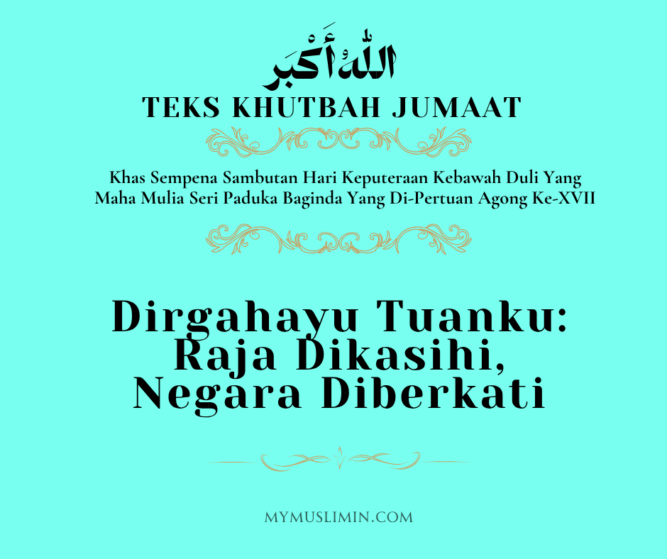 Dirgahayu Tuanku! Khatib dan seluruh rakyat dengan penuh hormat dan takzim merafak sembah menjunjung kasih atas kepimpinan Tuanku yang berjiwa rakyat. Khatib dan rakyat sekalian mendoakan semoga Allah SWT terus melimpahkan keberkatan usia, kesihatan yang sempurna, serta taufik dan hidayah kepada Tuanku dalam memayungi rakyat serta memelihara kedaulatan negara tercinta ini. Daulat Tuanku!