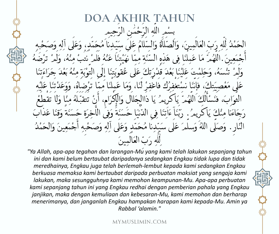 “Ya Allah Yang Kekal Abadi, dengan limpah kurnia dan kemurahan-Mu pada tahun baharu yang menjelang tiba ini, kami memohon pemeliharaan dan perlindungan-Mu daripada syaitan yang direjam dan semua pengikut serta pembantu-pembantunya. Kami memohon pertolongan-Mu mengatasi nafsu yang sentiasa mendorong kepada kejahatan, dan bantulah kami melakukan segala perkara yang memungkinkan kami mendampingi-Mu. Ya Allah Tuhan Yang Maha Berkuasa mengubah segala keadaan, dengan kekuasaan-Mu Yang Maha Agung, ubahkanlah keadaan kami kepada sebaik-baik keadaan. Amin ya Rabbal ‘alamin.”