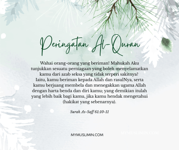 Keuntungan sebenar bukan pada dunia, tetapi pada ‘tijarah’ bersama Allah: keimanan, jihad dengan harta dan tenaga, yang membawa kita ke syurga dan jauh dari azab neraka.