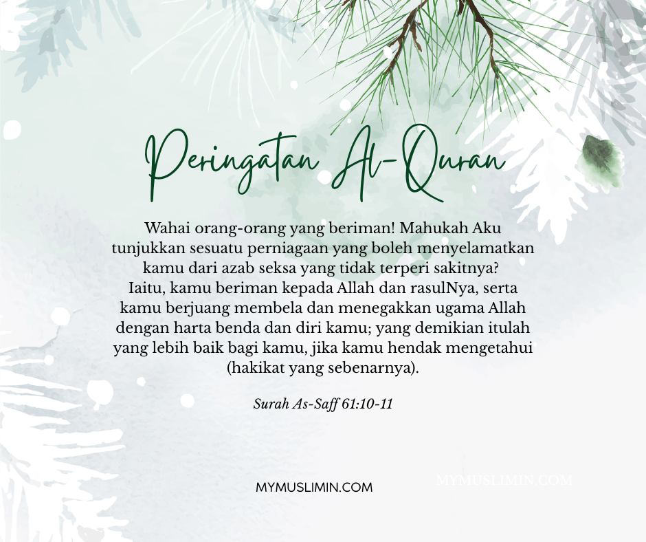 Maksudnya: Wahai orang-orang yang beriman! Mahukah Aku tunjukkan sesuatu perniagaan yang boleh menyelamatkan kamu dari azab seksa yang tidak terperi sakitnya? Iaitu, kamu beriman kepada Allah dan rasulNya, serta kamu berjuang membela dan menegakkan ugama Allah dengan harta benda dan diri kamu; yang demikian itulah yang lebih baik bagi kamu, jika kamu hendak mengetahui (hakikat yang sebenarnya).