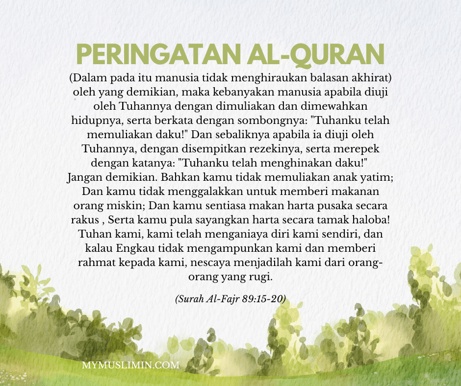 Dalam Surah Al-Fajr ayat 15–20, Allah menegur satu kesilapan besar manusia iaitu menyamakan nikmat dunia dengan kemuliaan di sisi Tuhan.