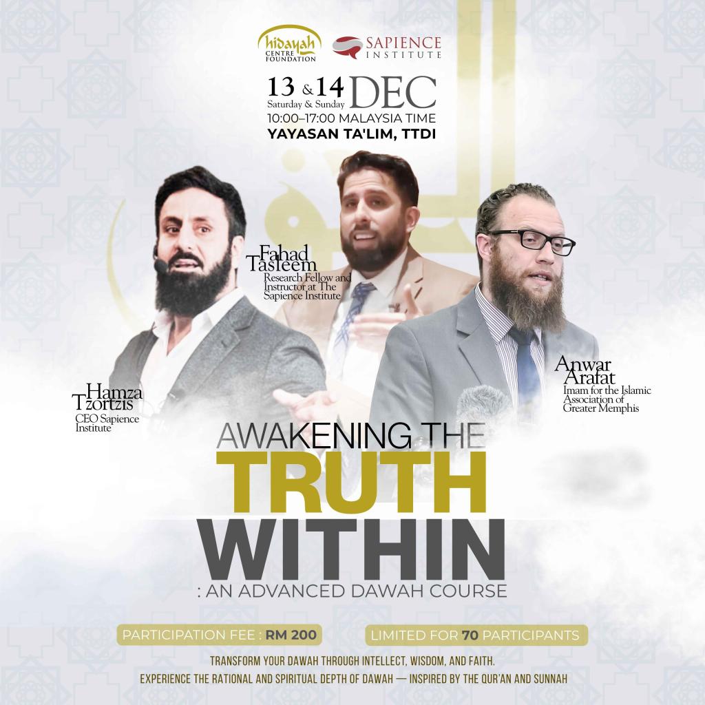 Featuring Ustadh Hamza Tzortzis, Ustadh Anwar Arafat, and Ustadh Fahad Tasleem, this exclusive two-day da’wah intensive by Hidayah Centre Foundation & Sapience Institute offers a rare chance to learn directly from three globally respected educators. Deepen your da’wah methodology through rational, existential, experiential, and spiritual frameworks rooted in the Qur’an and Sunnah.