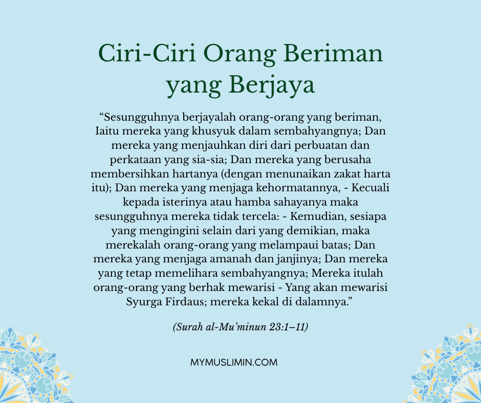 “Sesungguhnya berjayalah orang-orang yang beriman,Iaitu mereka yang khusyuk dalam sembahyangnya; Dan mereka yang menjauhkan diri dari perbuatan dan perkataan yang sia-sia; Dan mereka yang berusaha membersihkan hartanya (dengan menunaikan zakat harta itu); Dan mereka yang menjaga kehormatannya, – Kecuali kepada isterinya atau hamba sahayanya maka sesungguhnya mereka tidak tercela: – Kemudian, sesiapa yang mengingini selain dari yang demikian, maka merekalah orang-orang yang melampaui batas; Dan mereka yang menjaga amanah dan janjinya; Dan mereka yang tetap memelihara sembahyangnya; Mereka itulah orang-orang yang berhak mewarisi -Yang akan mewarisi Syurga Firdaus; mereka kekal di dalamnya.”
