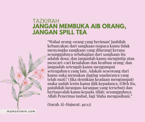 Di zaman sekarang, budaya “spill tea” atau membocorkan rahsia dan aib orang lain semakin mudah tersebar, terutamanya di media sosial. Kadang-kadang kita rasa sekadar bergurau atau berkongsi gosip, tapi sebenarnya ia menyebarkan fitnah, mencederakan hati, dan merosakkan ukhuwah.