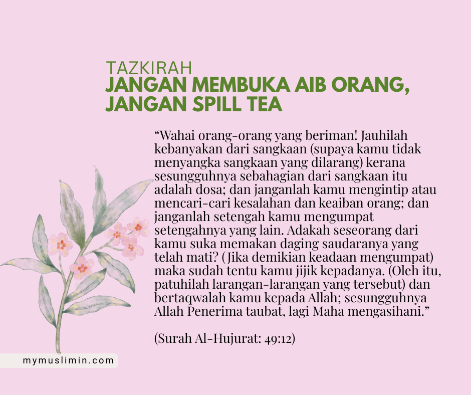 Di zaman sekarang, budaya “spill tea” atau membocorkan rahsia dan aib orang lain semakin mudah tersebar, terutamanya di media sosial. Kadang-kadang kita rasa sekadar bergurau atau berkongsi gosip, tapi sebenarnya ia menyebarkan fitnah, mencederakan hati, dan merosakkan ukhuwah.