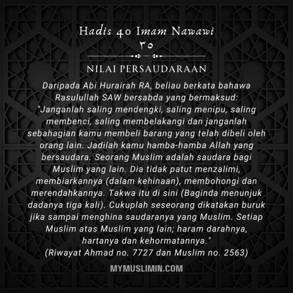 Hadis ke 35 ini mengandungi nilai penting dan utama dalam skop persaudaraan Islam. Maka, janganlah kita amalkan perkara yang ditegah untuk memelihara ukhwah Islam.