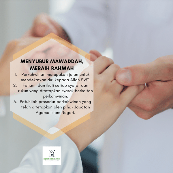 Perkahwinan merupakan suatu ibadah dalam Islam. Ia juga merupakan satu ikatan perjanjian yang diikat oleh Allah SWT antara seorang lelaki (suami) dengan seorang perempuan (isteri). Pimpin dan bimbinglah keluarga kita ke jalan yang diredai Allah SWT agar bersama-sama mendapat kejayaan di dunia dan di akhirat serta perkahwinan yang diimpikan iaitu sakinah, mawaddah dan rahmah.